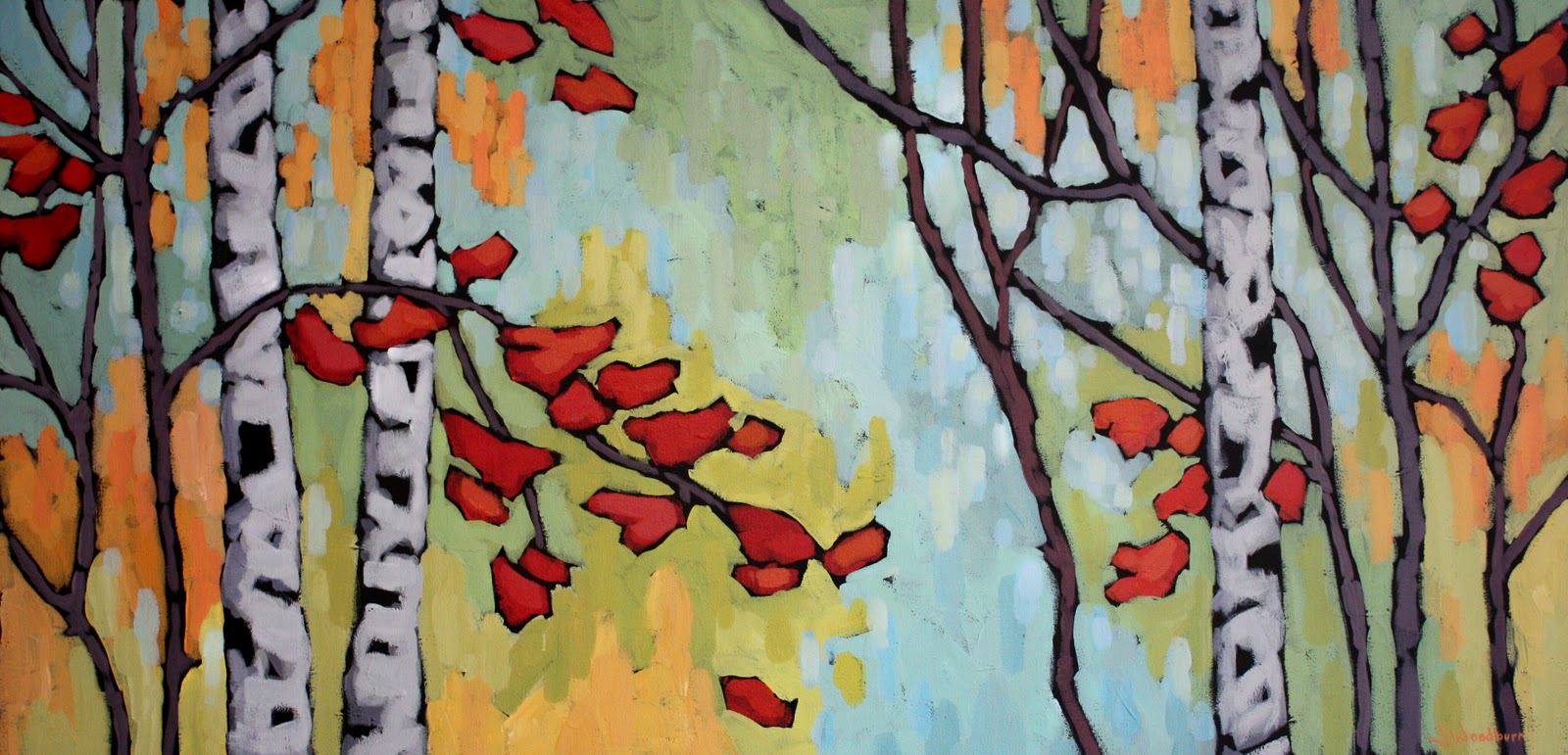 This painting is part of a new Fall series that I am exploring, contrasting birch trees with maple saplings. It is a celebration of the changing colours in our regional forests. I am very excited about it. More coming soon.